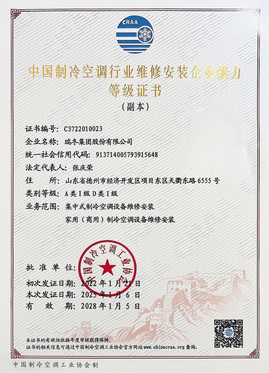 شهادة اعتماد الجمعية الصينية لصناعة التبريد وتكييف الهواء (CRAA) لخدمات التركيب -